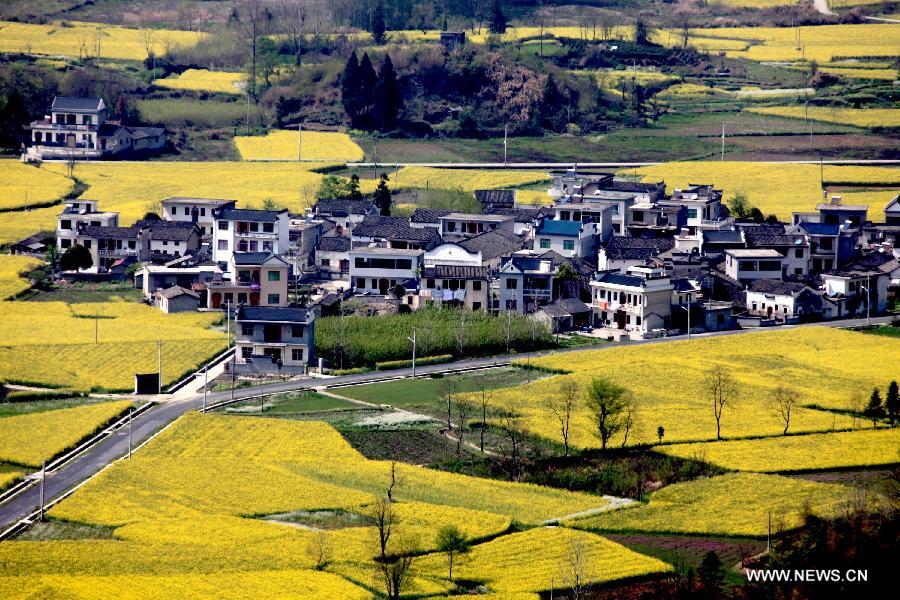 Residential buildings are seen in the cole flower fields in Yixianke Village of Huangshan City, east China's Anhui Province, April 4, 2014. Photo/Xinhua]
