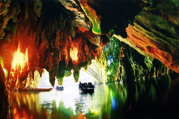 Visitors take a boat trip through the Dragon Palace, a natural karst cave with stalactites.