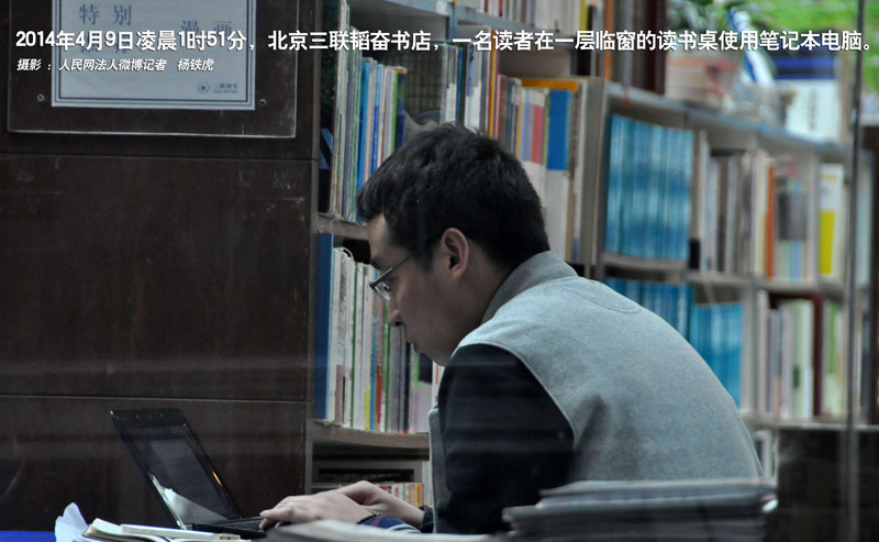 The Sanlian Taofen bookstore has begun a test run of 24*7 opening hour. The late night bookstore experience was started on April 8, 2014. The bookstore will arrange tables and heated cushions for readers at night and provide detailed and thoughtful service for them.