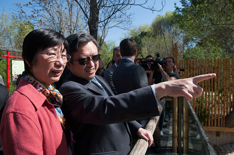 Chinese ambassador to Spain Zhu Bangzao (second left) visits Xing Bao in Madrid Zoo April 9, 2014. (Photo/Xinhua) |