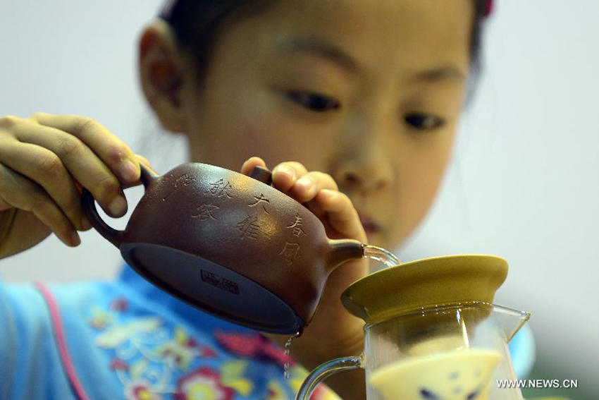 A girl performs tea art during a tea art competition among primary school pupils in Hangzhou, capital of east China's Zhejiang Province, April 12, 2014. A youth tea art competition kicked off in Hangzhou on Saturday, in which pupils of 19 groups presented their knowledge of tea and skills of tea art. (Xinhua/Li Zhong)