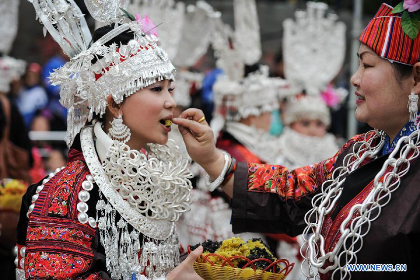 A girl of Miao ethnic group has "sisters dinner" to celebrate the Miao Sisters Festival in Taijiang County, Miao-Dong Autonomous Prefecture of Qiandongnan, southwest China's Guizhou Province, April 13, 2014. The Miao Sisters Festival, regarded as the ethnic Miao's folk Valentine's Day, is held annually around the 15th day of the third lunar month according to the Miao's calendar. (Xinhua/Ou Dongqu) |
