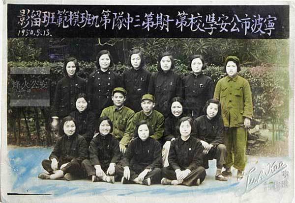 Hand-colored photo taken on May 13, 1950 shows a class of female officers at the Ningbo Public Security School. Photo provided by Dai Zibin (second left), former director of the school.