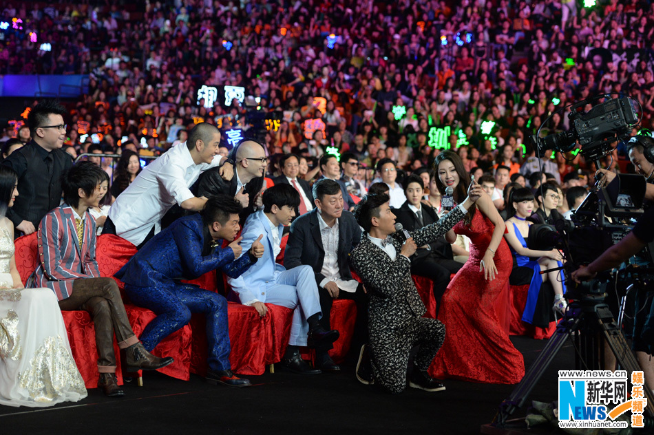 Photo taken on April 13, 2014 shows that celebrities pose for a photo during Top Chinese Music award in Shenzhen, China.[Photo/xinhua]