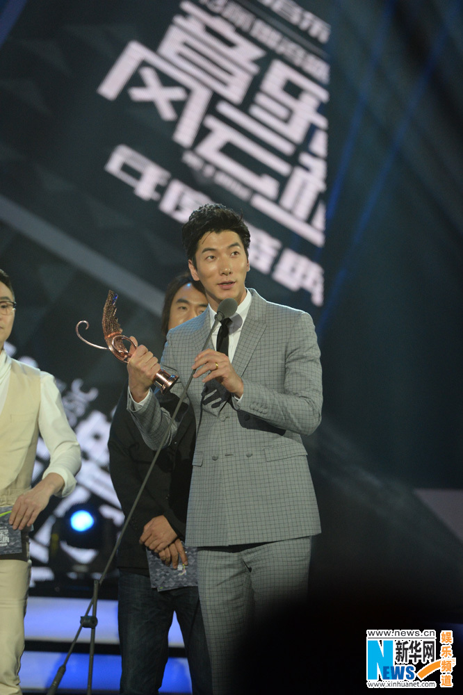 Photo taken on April 13, 2014 shows that celebrities pose for a photo during Top Chinese Music award in Shenzhen, China.[Photo/xinhua]