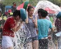 Girls of the Dai ethnic group fetch water during the Water-splashing Festival in Jinghong City of Dai Autonomous Prefecture of Xishuangbanna, southwest China's Yunnan Province, April 15, 2014. People splash water to each other to express best regards on Tuesday, the last day of the 2014 Water-splashing Festival and the 1376 New Year of the Dai ethnic group. (Xinhua/Lin Yiguang)