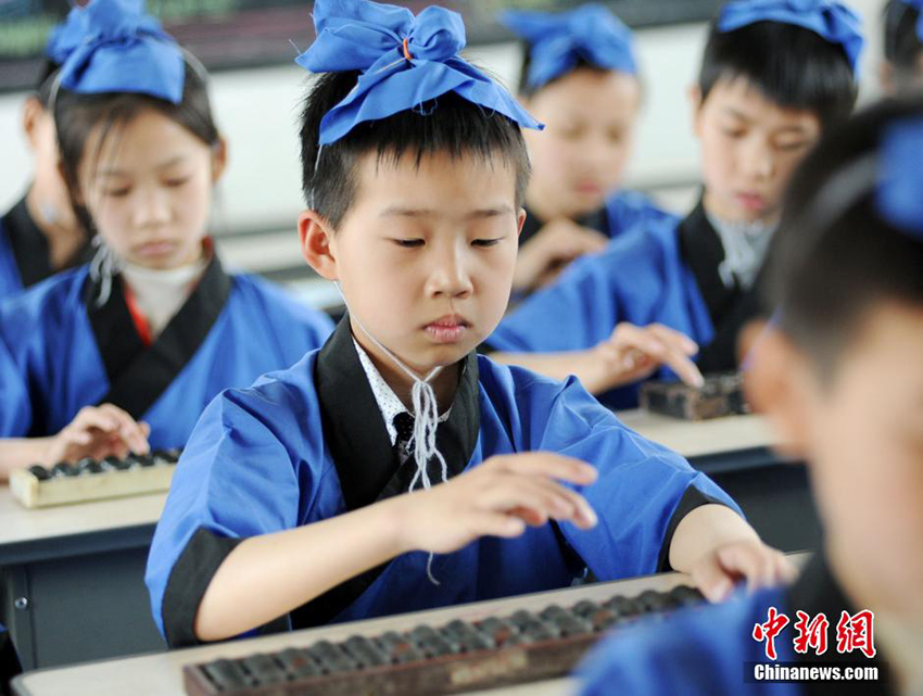 Children in ancient costumes learn Zhusuan in a primary school in Wuyuan County, southeast China's Jinagxi Province, April 13, 2014. They paid a visit to a 10-meter-long and three-meter-wide giant abacus in the county and experienced the charm of traditional culture.