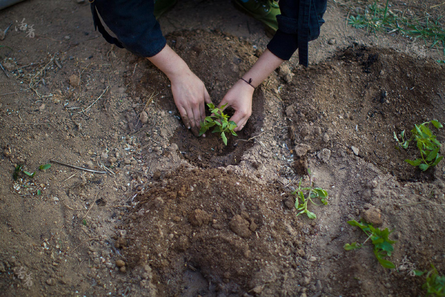 Xing Zhen plants tomato seedlings. Xing and her husband Tang Guanhua named their home "Self-sufficiency Lab" – and they focus on self-reliance and creating an idyllic lifestyle.