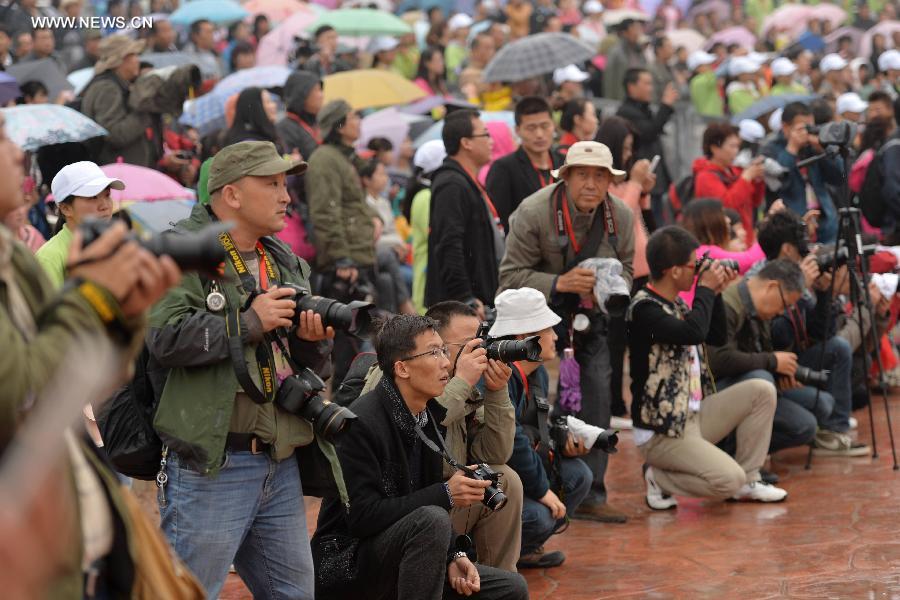 Local residents take pictures of the opening ceremony of the 31st peach blossom tourism festival in Lanzhou, capital of northwest China's Gansu Province, April 20, 2014. The festival, which kicked off on the day of Guyu (Grain Rain), one of the 24 solar terms created by ancient Chinese to carry out agricultural activities according to position of sun at the zodiacal circle, will last until October. (Xinhua/Chen Bin)