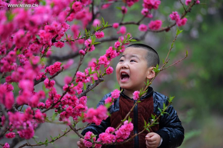 A boy plays among peach blossom during the 31st peach blossom tourism festival in Lanzhou, capital of northwest China's Gansu Province, April 20, 2014. The festival, which kicked off on the day of Guyu (Grain Rain), one of the 24 solar terms created by ancient Chinese to carry out agricultural activities according to position of sun at the zodiacal circle, will last until October. (Xinhua/Chen Bin)