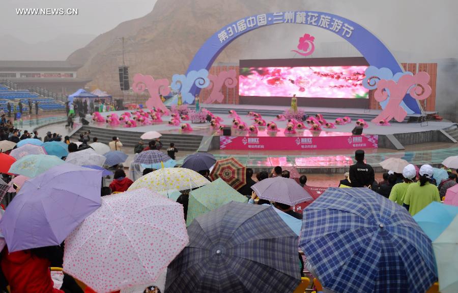 Local residents watch performance in rain at the opening ceremony of the 31st peach blossom tourism festival in Lanzhou, capital of northwest China's Gansu Province, April 20, 2014. The festival, which kicked off on the day of Guyu (Grain Rain), one of the 24 solar terms created by ancient Chinese to carry out agricultural activities according to position of sun at the zodiacal circle, will last until October. (Xinhua/Chen Bin)