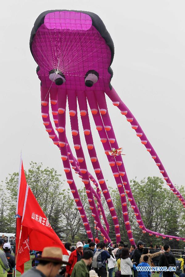 An octopus-shaped kite flies in sky during the 31st Weifang International Kite Festival in Weifang, east China's Shandong Province, April 19, 2014. [Xinhua/Zhang Chi]