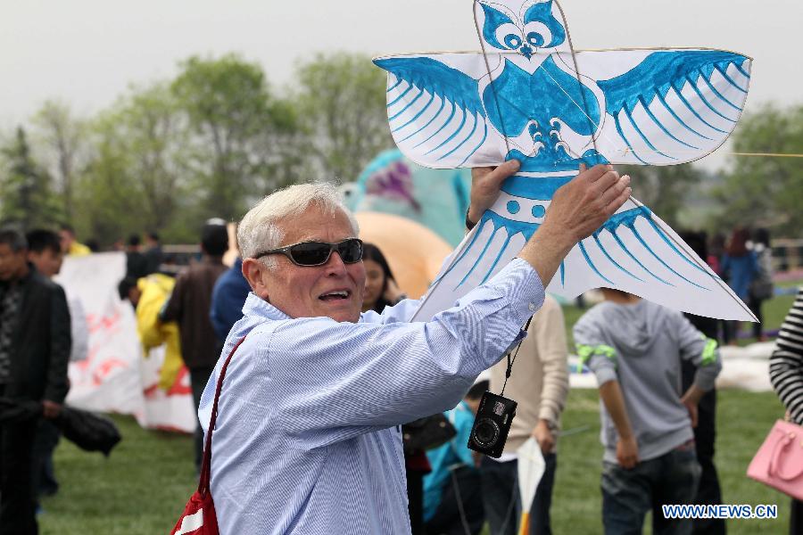 A foreign participant tries to fly a kite during the 31st Weifang International Kite Festival in Weifang, east China's Shandong Province, April 19, 2014. [Xinhua/Zhang Chi]