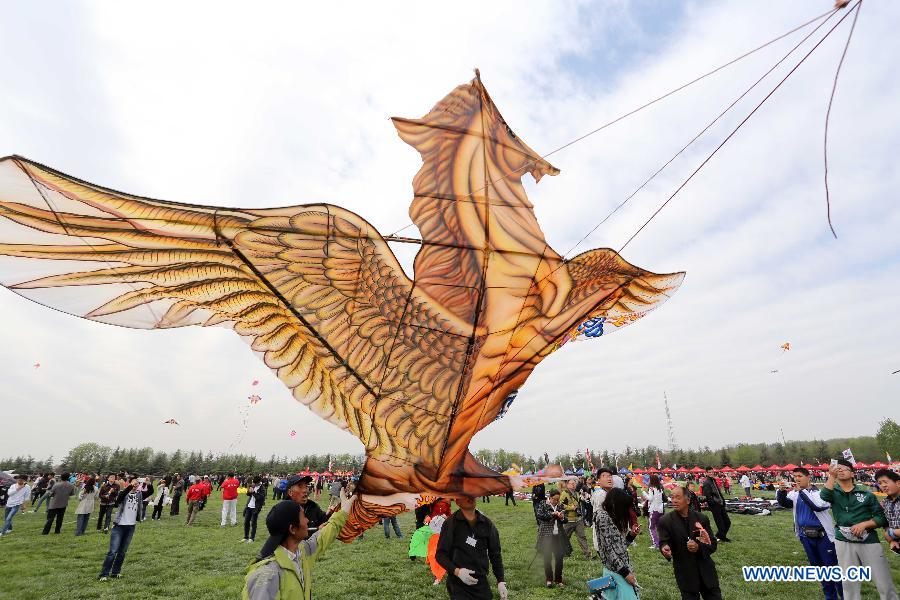 Contestants try to fly a horse-shaped kite during the 31st Weifang International Kite Festival in Weifang, east China's Shandong Province, April 19, 2014. [Xinhua/Zhang Chi]