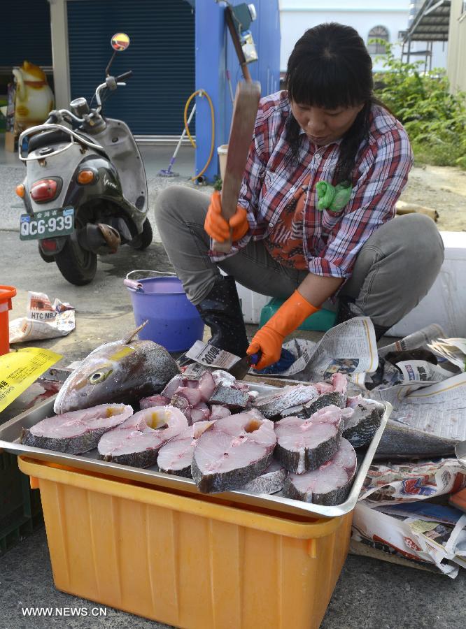 A woman sells fishes on a street in Liouciou Township in Pingtung County, southeast China's Taiwan, April 21, 2014. Liouciou township, which locates 8-9 nautical miles away from the Taiwan Island, has an area of 6.8 square meters. [Photo/Xinhua/Huang Xiaoyong]