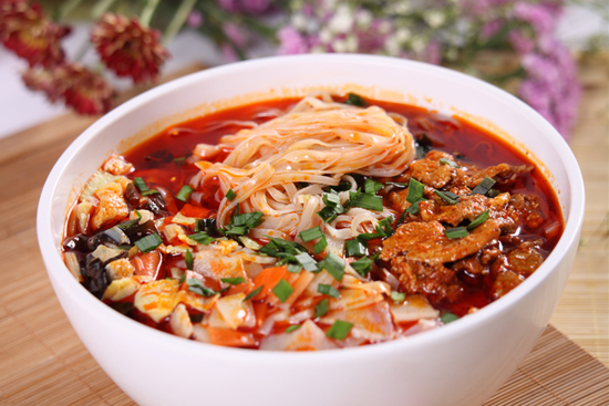 First braise the meat. Add vinegar and chili powder and fry over a medium heat until it is red and lucent. The taste – sour and hot but not pungent – is the essence of Qishan saozi noodles.