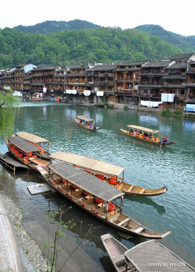 Tourists travel by boats at the Fenghuang ancient town, in Xiangxi Tujia-Miao Autonomous Prefecture of central China's Hunan Province, April 22, 2014. (Xinhua/Long Hongtao)