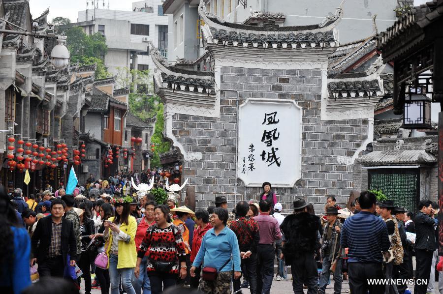 Tourists visit the Fenghuang ancient town, in Xiangxi Tujia-Miao Autonomous Prefecture of central China's Hunan Province, April 22, 2014. (Xinhua/Long Hongtao)