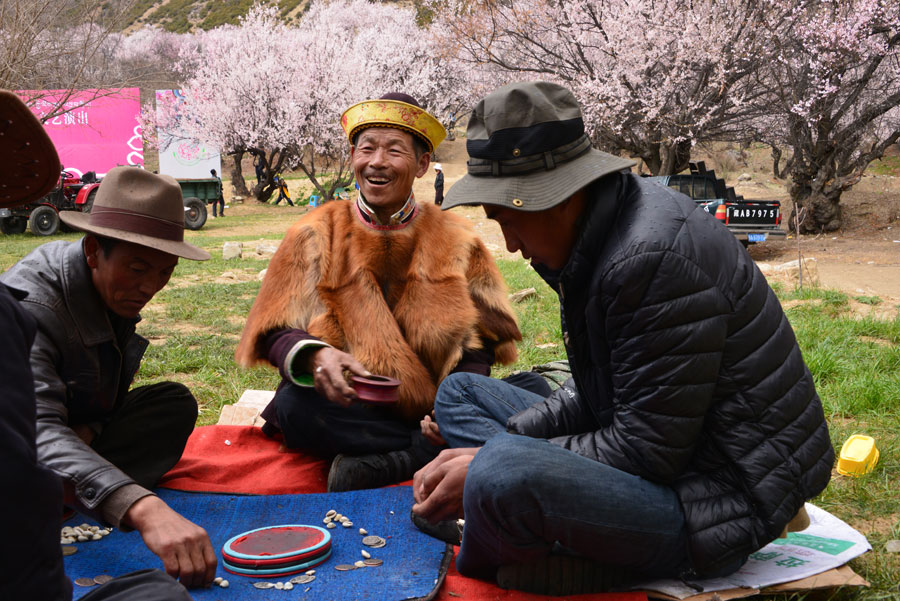 The villagers put on their richest clothes. Some perform traditional archery, some play cards and have a chat, and some even sit under the peach trees, enjoying sunshine and the fragrance of the flowers. [Photo: CRIENGLISH.com/ Xia Jixuan]