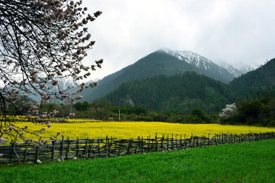 In Nyingchi, you can enjoy the view of Tibet's four seasons all at once. Down in the valley, when the willows start budding, the withered grass on the river bank still preserves the autumn yellow. While the peach flowers are still in full bloom at the mountain foot, up on the mountains, the snow has yet to start melting. [Photo: CRIENLGISH.com/ Xia Jixuan]