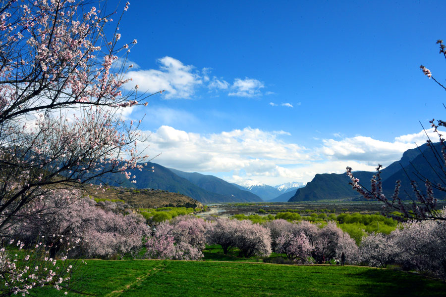 The Gala village in Nyingchi is a popular choice for those wanting to enjoy the peach flowers. While the mountains afar are still covered with snow, peach flowers are already in full blossom. Peach trees dot the cornfields on the mountainside along the Nyang river. [Photo: CRIENGLISH.com/ Xia Jixuan]