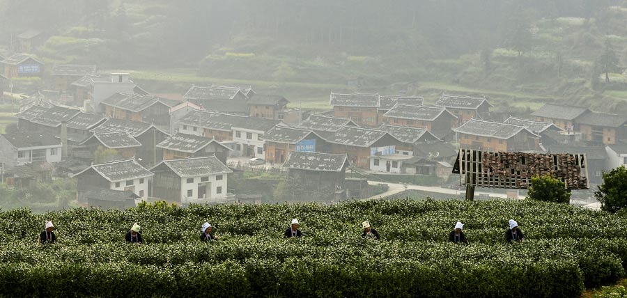 At the crack of dawn, harvesters are busy picking leaves.(China Daily/Tian Weitao)
