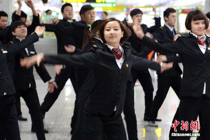 Staff members of Suzhou Subway Line 2 perform a flash mob dance in the hall of Guangjinanlu Station April 28, 2014. (Photo/Chinanews.com)