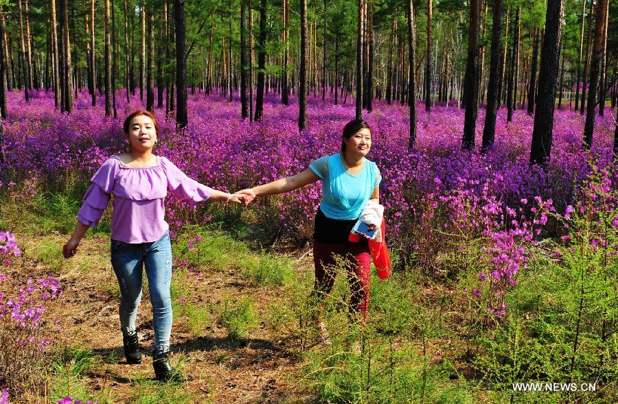 Two tourists walks in a pine forest with blossoming rhododendrons near Oupu Township of Huma County, northeast China's Heilongjiang Province, April 29, 2014. (Xinhua/Zhou Changping)