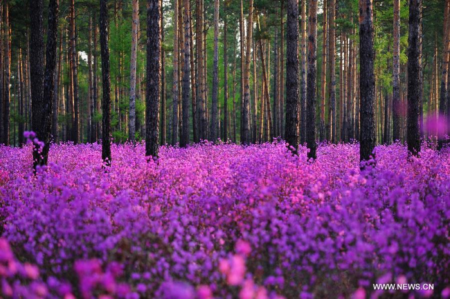 Rhododendrons blossom in a pine forest near Oupu Township of Huma County, northeast China's Heilongjiang Province, April 29, 2014. [Photo/Xinhua/Zhou Changping]