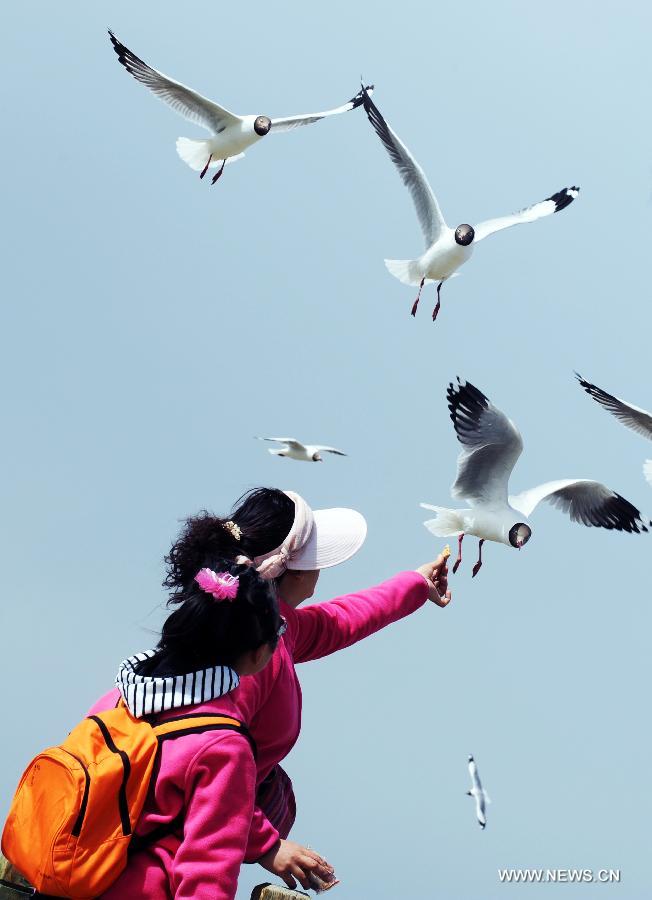 Tourists feed gulls at the Qinghai Lake in northwest China's Qinghai Province, April 29, 2014. [Photo/Xinhua/Hou Deqiang]