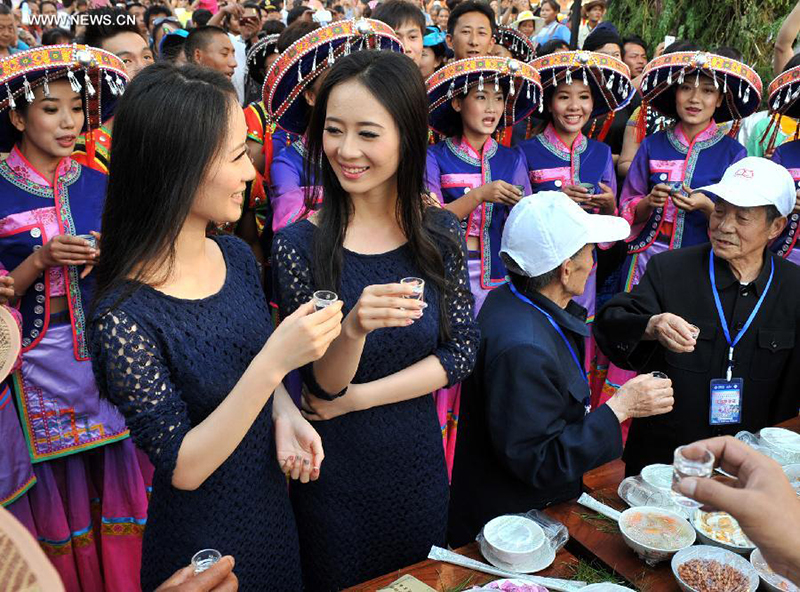 Twins and tourists enjoy a feast during the 10th twins festival in the Hani Autonomous County of Mojiang, southwest China's Yunnan Province, May 1, 2014. A traditional Hani nationality feast on 1-kilometer-long table was held here on Thursday during the festival with participation of more than 1,000 pairs of twins and triplets. (Xinhua/Chen Haining) |