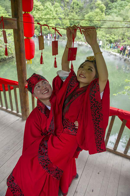 A bride ties the knot carried by her bridegroom during a group wedding staged in traditional style in Youyang, Chongqing municipality, on May 2, 2014. [Photo/Xinhua]