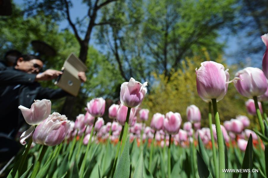 A citizen takes photos of blossoming tulips at People's Park in Xining, capital of northwest China's Qinghai Proince, May 4, 2014. (Xinhua/Wu Gang)