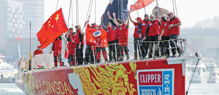 The Qingdao, China's entry in the Clipper Round the World Race, leaves Qingdao International Marina for San Francisco at the start of the sixth leg on March 16. Xu Chongde / for China Daily