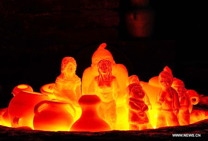 Photo taken on May 4, 2014 shows calcined sandy objects in Liuhe Township of Yingjing County, southwest China's Sichuan Province. The craftsmanship of making sandy objects in Yingjing County has a history of more than 2,000 years and it has been listed as China's national intangible cultural heritage. (Xinhua/Jiang Hongjing)