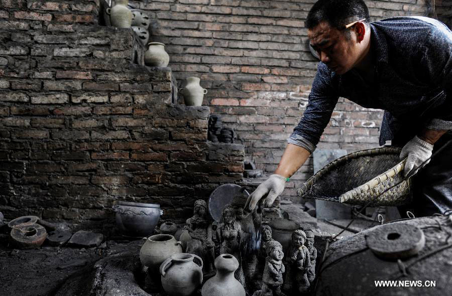 Inheritor of Yingjing sandy objects Zeng Qinghong casts powder into sandy objects in Liuhe Township of Yingjing County, southwest China's Sichuan Province, May 4, 2014. The craftsmanship of making sandy objects in Yingjing County has a history of more than 2,000 years and it has been listed as China's national intangible cultural heritage. (Xinhua/Jiang Hongjing)