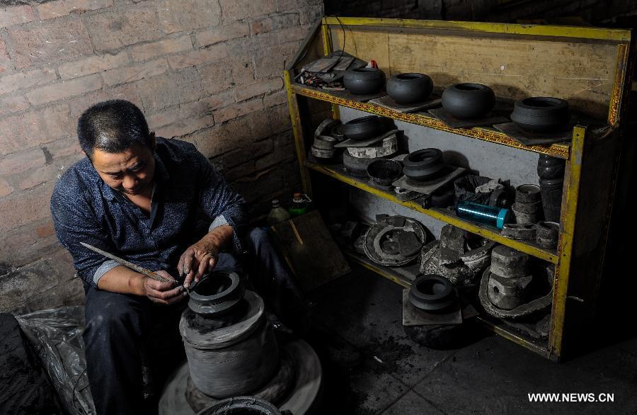 Inheritor of Yingjing sandy objects Zeng Qinghong makes sandy objects in Liuhe Township of Yingjing County, southwest China's Sichuan Province, May 4, 2014. The craftsmanship of making sandy objects in Yingjing County has a history of more than 2,000 years and it has been listed as China's national intangible cultural heritage. (Xinhua/Jiang Hongjing)