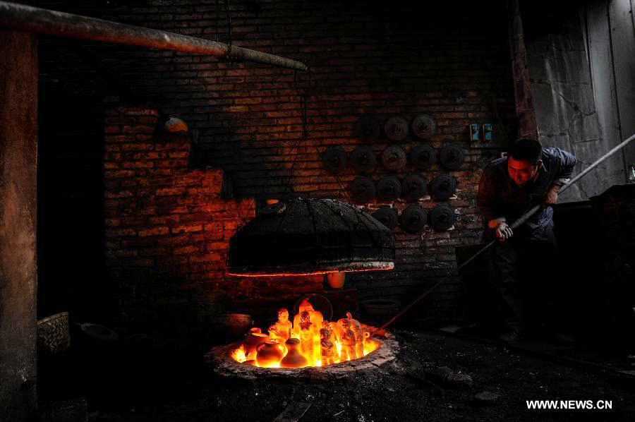Inheritor of Yingjing sandy objects Zeng Qinghong adjusts duration of heating as he calcines sandy objects in Liuhe Township of Yingjing County, southwest China's Sichuan Province, May 4, 2014. The craftsmanship of making sandy objects in Yingjing County has a history of more than 2,000 years and it has been listed as China's national intangible cultural heritage. (Xinhua/Jiang Hongjing)