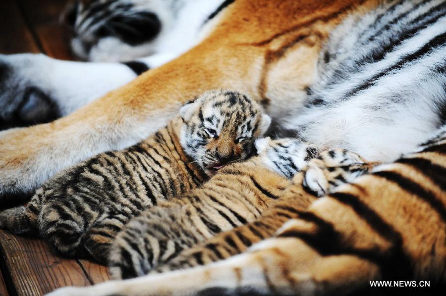 Three Siberian tiger cubs suck milk at the Heilongjiang Siberian Tiger Garden, the world's largest breeding center for Siberian tigers, in Harbin, capital of northeast China's Heilongjiang Province, May 6, 2014. A 12-year-old Siberian tiger gave birth to three female cubs on April 26 in the breeding center. About 100 Siberian tiger cubs are expected to be born in the center this year. (Xinhua/Wang Jianwei)
