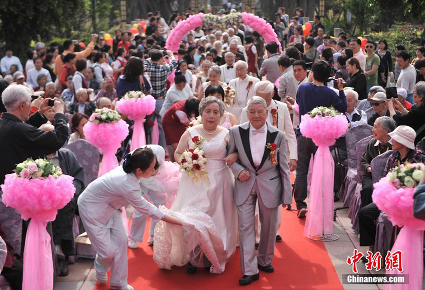 19 old couples, with roses in hands, attend a golden wedding celebration in Chongqing on May 11, 2014. They have been married for more than half a century. The oldest among these them is 94 years old and the longest marriage has been 70 years old. (CNS/Chen Chao) |