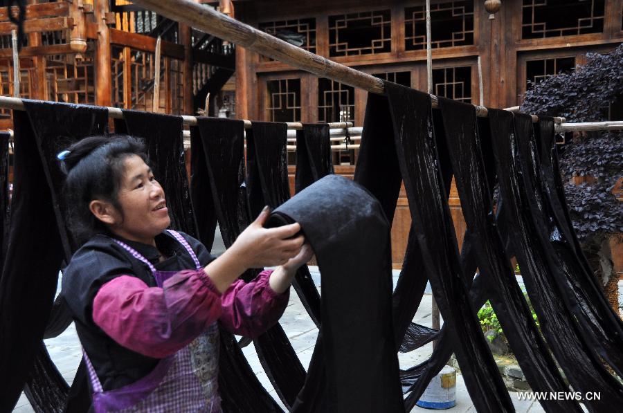 A woman of the Dong ethnic group airs the newly-made cloth in Zhaoxing Dong Village of Liping County, southwest China's Guizhou Province, April 30, 2014. The handmade cloth is mainly used by local people to make traditional costumes of the Dong ethnic group.[Photo/Xinhua/Yang Wenbin]