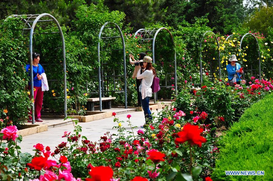 Tourists take photos of Chinese roses during the Chinese rose cultural festival at the Beijing Botanical Garden in Beijing, capital of China, May 15, 2014. (Xinhua/Ma Zhiyu)