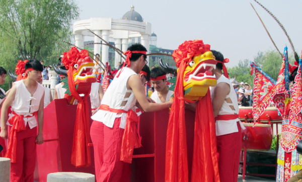 People at Xiadu Park in Yanqing county, Beijing, prepare a dragon boat for the sixth Beijing Duanwu Cultural Festival on May 18, 2014. [Photo by Liao Wei/chinadaily.com.cn]
