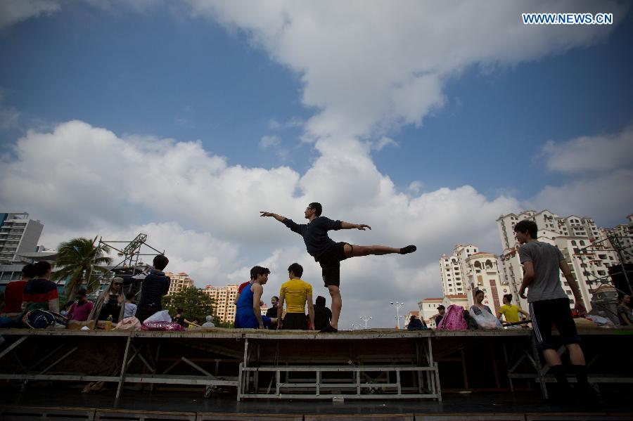 Li Jun, a 33-year-old ballet dancer of the National Ballet of China, practices before performance on a makeshift stage in Qionghai, south China's Hainan Province, Jan. 10, 2014. Before being able to present perfect performance in the spotlight, every member of the National Ballet of China has to undergo severe arduous training for years. Yet they chose to persevere in what they truely love. Years of toiling not only allows them good body shape, expertise and disposition, but also offers them a life-long goal that deserves pursuing. The glory on stage is only a small fraction of all the time they devoted to the art. What is hidden to the audience is the integration of ballet with their lives, which could be felt every minute in their practice, during the breaks and on their journeys. (Xinhua/Zhang Cheng)