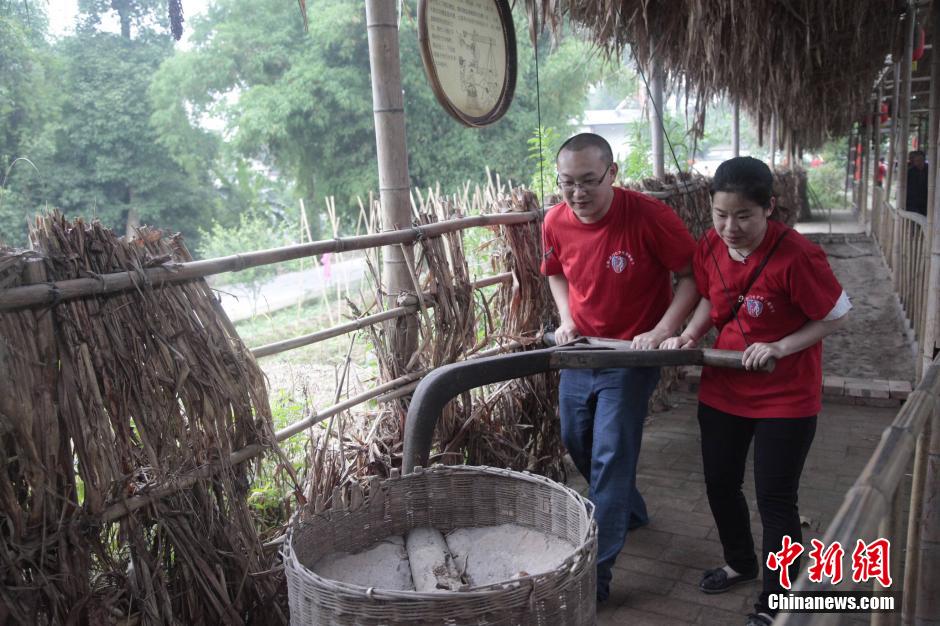 Couples experience "men plow and women weave" type of love at the 7th Chinese Oriental Valentine's Day Festival in Jiangjin District, southwest China’s Chongqing, May 20, 2014. (photo/ecns.cn)