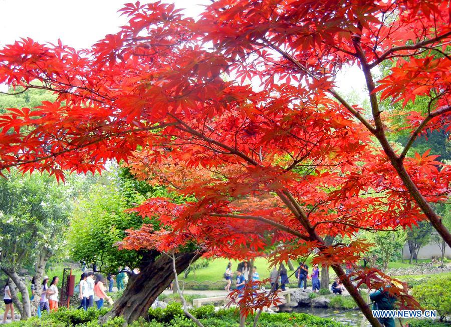 Visitors are seen at the Zhuozhengyuan Garden which is decorated by the red leaves of Japanese maple trees in Suzhou City, east China's Jiangsu Province, May 22, 2014. (Xinhua/Wang Jiankang)