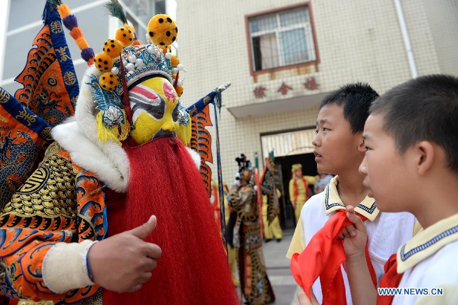 A Peking opera actor introduces Peking opera facial masks and costumes to pupils during an event "Peking Opera Comes to Campus" at Haojiaxiang Elementary School in Xi'an, capital of north China's Shaanxi Province, May 22, 2014. (Xinhua/Li Yibo)