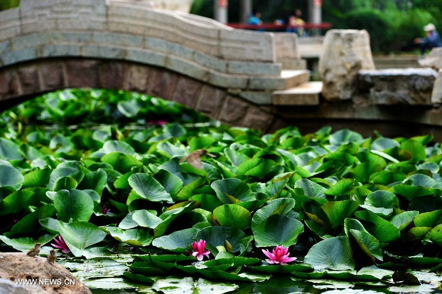 Photo taken on May 24, 2014 shows water lily flowers at Shunyu Park in Jinan, capital of east China's Shandong Province, May 24, 2014. (Xinhua/Guo Xulei)