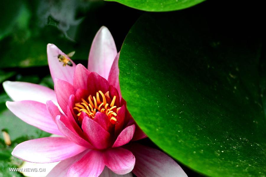 A bee flies over a water lily flower at Shunyu Park in Jinan, capital of east China's Shandong Province, May 24, 2014. (Xinhua/Guo Xulei)