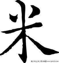 The oraclescript character for mi looks like scattered grains of rice. The horizontal stroke in the middle depicts the partition of a shelf used for storing rice. Chinese characters with the radical of mi are all related to food.